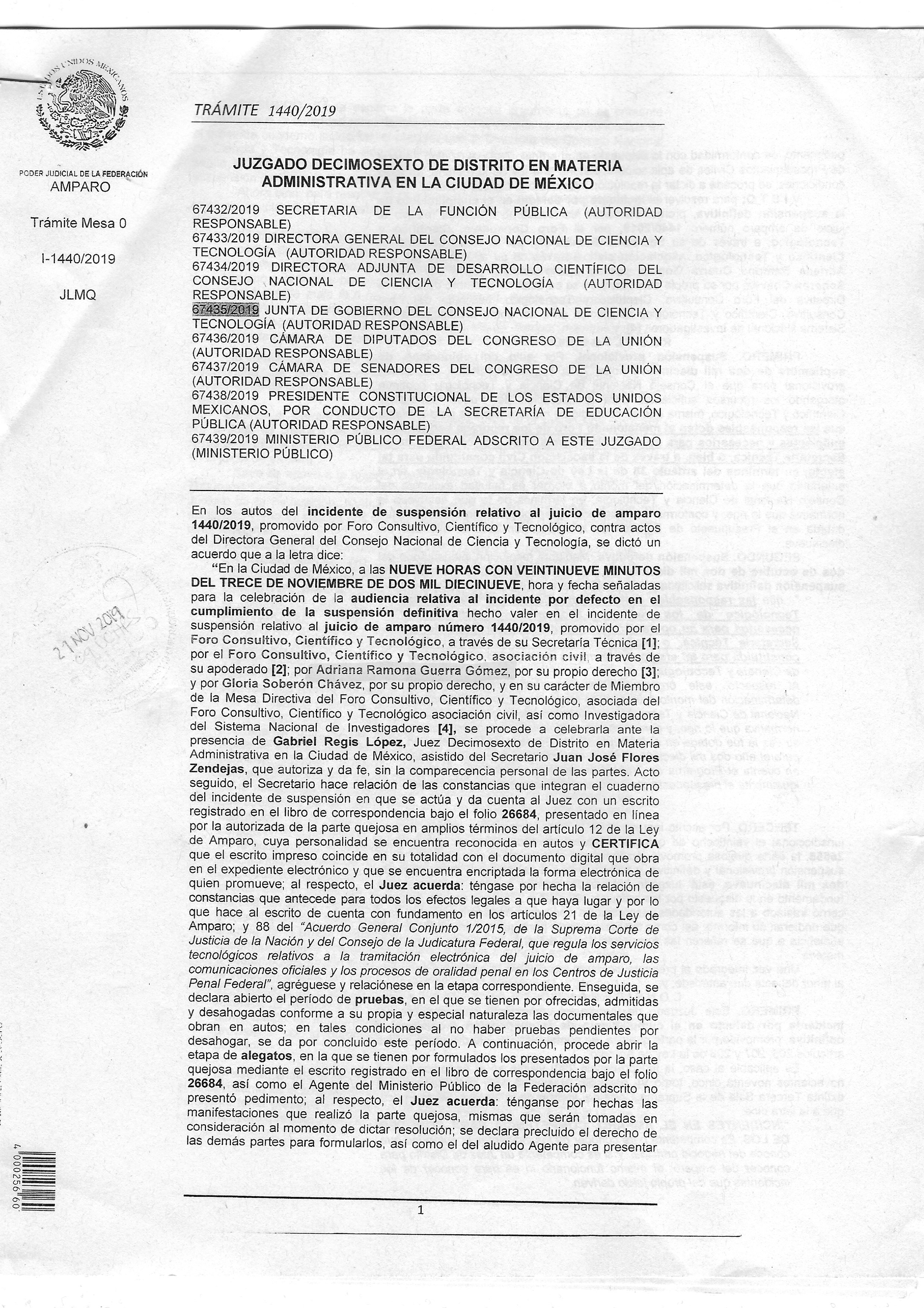 26 de septiembre de 2019-Conacyt es notificado del juicio de Amparo 1440/2019 en el que Adriana Ramona Guerra Gómez, secretaria técnica del Foro, A.C., en su carácter de primer interesada, denuncia al órgano de ciencia ante el Juez Décimo de Distrito en materia administrativa en la Ciudad de México. La persona que presentó la demanda argumenta que Conacyt aplicó mal las instrucciones de un oficio entregado en el mes de agosto pero no especifican de qué se trata el papel.