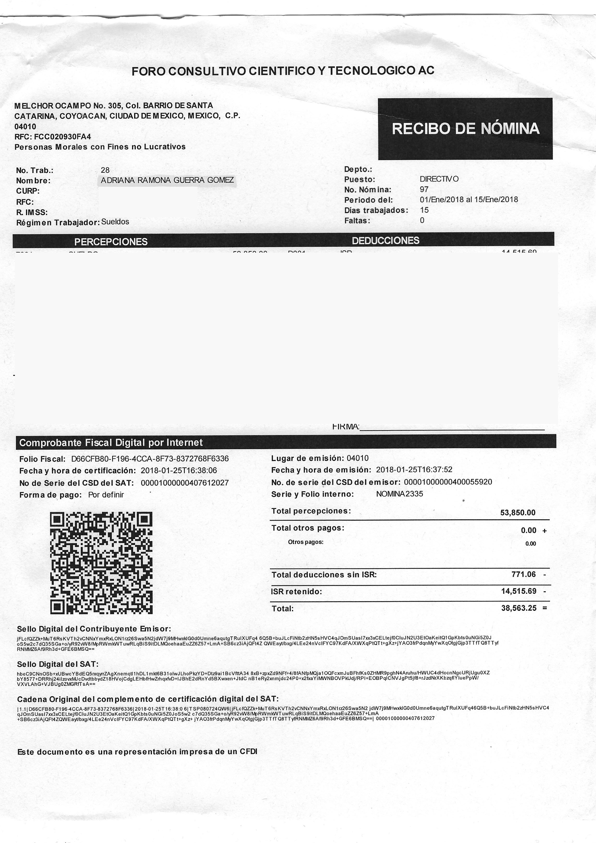 26 de septiembre de 2019- La secretaria técnica del Foro A.C., Adriana Ramona Guerra Gómez, percibió durante ese periodo 53,850 pesos quincenales; es decir, 107,700 pesos al mes. El sueldo más alto de un funcionario público en el país lo ostenta el presidente Andrés Manuel López Obrador, quién recibe 108,659 pesos mensuales. Estos meses no son los correspondientes al aguinaldo debido a que lo correspondiente a esa prestación le fue entregado la segunda quincena de junio por el monto de 134,600 pesos.